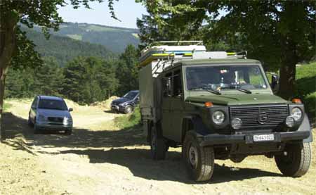 Der 22. Juni 2003 war in meiner Agenda schon lange dick angestrichen: Der Swiss-G-Club trifft sich zu einer Geländefahrt in Ederswiler. Das Wetter könnte nicht besser sein, wochenlang hat es nicht geregnet. Um 10.15 Uhr heisst Josef Eichholzer alle Erschienenen herzlich willkommen. Er ruft allen noch einmal wichtige Sicherheitsregeln in Erinnerung. Dann geht es los: Für einmal verzichten wir auf das Abschreiten des Geländes zu Fuss und machen eine Besichtigungsrunde gleich mit den Fahrzeugen. Im Anschluss entsteht das unvollständige Gruppenbild; viele sind später noch dazugekommen. Nachdem sich alle ausgiebig durch das Gelände geschafft haben, ist das Feuer zum Grillieren bereit. Eine grosse Halle spendet Schatten, für Tische und Bänke ist gesorgt. Gesprächsthema ist unter anderem auch das Off-road-Festival, welches dieses Wochenende in Studen stattfindet. Am Nachmittag kann man noch einmal fahren so lange